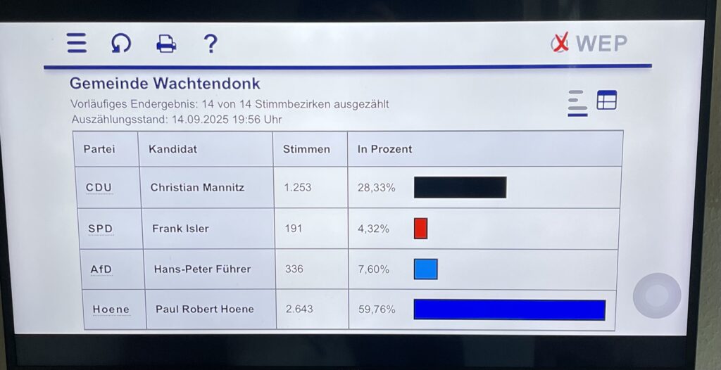 Für dieses große Vertrauen bedanke ich mich von Herzen bei allen Wählerinnen und Wählern, bei all denen, die mich aktiv unterstützt haben (insbesondere meiner Familie), beim mich unterstützenden Wachtendonker Bürgerverein (https://www.wbv-wachtendonk.de), aber auch beim ganzen Team der Gemeindeverwaltung und allen Wahlhelferinnen und Wahlhelfern.